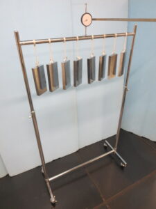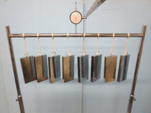 ハンガー用レールのたわみ試験(JIS S 1200) 2026/2/4 目的 ハンガー用レールは、クローゼットや収納スペースで衣類を掛けるために日常的に使われる重要な部品です。長期間にわたり荷重がかかるため、耐久性と安全性の確保が欠かせません。「たわみ試験」は、実際の使用環境を想定し、レールがどの程度たわむかを測定することで、製品の強度・耐久性・安全性を科学的に評価します。この試験により、以下のようなリスクを未然に防ぐことができます。・レールの過度なたわみによる衣類の落下・レールの破損による事故やケガまた、JIS(日本産業規格)に基づく試験であるため、公的な品質基準への適合性も確認可能です。メーカーにとっては製品改良や品質向上の指標となり、消費者にとっては安心して使える製品選びの目安となります。ボーケンでは、こうした評価を通じて、安全で信頼性の高い製品の普及を支援しています。 試験方法 JIS S 1200:2012 6.3.2に準拠 試験前の準備として、ハンガー用レールを水平な床面に設置し、脚の浮きやガタツキなどを確認します。次に幅及び高さ調節機能があるものにあっては、最大限に調節し、試験をする部分以外の部分に規定の重りを載荷します。規定の重りを載荷する際は支持間距離を測り、その中央の場所へダイヤルゲージをセットします。 このように規定の荷重を掛け、規定時間が経過したら重りを除荷します。この試験により…「たわみ率(%)」、「残留たわみ率(%)」を算出します。〈規定のおもり〉規定のおもり(dm/kg)レベル1レベル2レベル3445試験時間は金属製:1時間、その他全て:1週間とします。試験時間やおもりの変更も可能です。たわみ率(%)=たわみ量 (mm)/支持間距離(mm)×100 判定基準例 JIS S 1033:2015 オフィス家具−収納家具 負荷時のたわみ率は、0.4%以下で、使用上支障のある破損及び変形がない。 ハンガー用レール耐荷重評価値測定 ハンガー用レールの表示耐荷重を求めるには?ボーケンではJIS法を準用した「ハンガー用レール耐荷重評価値測定(ボーケンオリジナル法)」にて妥当な表示耐荷重値をご提案いたします。※ハンガー用レール耐荷重評価値測定試験とは…規定のたわみ率を狙ってハンガー用レールに均等におもりを載荷していき、24時間放置した時の最大たわみ量ならびに外観を確認します。これらの情報から総合的に判断し、表示耐荷重を算出いたします。 家具のたわみ試験のご紹介 関連記事 棚板のたわみ試験(JIS S 1200)開き戸の耐久性試験 (JIS S 1200)引出しの耐久性試験 (JIS S 1200) お問合せ 上記試験に関するお問い合わせフォームはこちら 東京生活用品試験センター〒135-0001 東京都江東区毛利1丁目12番1号TEL:03-5669-1382 大阪生活用品試験センター〒552-0021 大阪市港区築港1丁目6番24号TEL:06-6577-0124