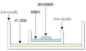 試験片(直径約4cm)をシャーレ(小)に敷き詰め、誘引用飼料0.05gを中央部分に置きます。ダニ培地(10,000匹相当分)をシャーレ(大)に均一にばらまき、シャーレ(大)の中央にシャーレ(小)を重ねて置きます。これを25±2℃,75±5%RH、暗条件で静置します。24時間後、シャーレ(小)内への侵入ダニ数を計数し、下記の式に従い忌避率を算出します。