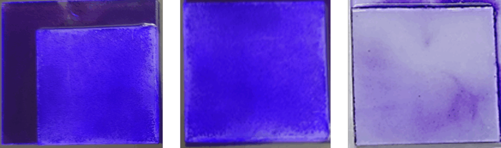 乾燥後、染色液(クリスタルバイオレット溶液)で染色します。