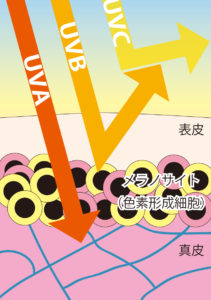 UV-B | 280~320nm | 肌の表皮層に作用し、日焼け(サンバーン)を起こし、色素沈着を促進させる。UV-Aの約1000倍の作用がある。 |