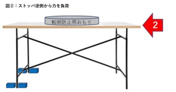 通常の使用状態のようにするため試験体を床面に設置し短辺側の脚に対しストッパを当てます。(キャスタや車輪等がある場合はその部分に対してストッパを当て、その部品も試験に含めます。)