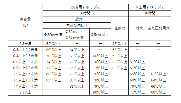 室温が20℃で無風に近い状態の部屋に2時間以上開栓して放置したまほうびんに沸騰水を入れ、95℃になったときに栓又は蓋をします。(ねじ締めによって固定する栓又は蓋は100N・㎝以上で締め付け)