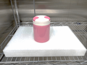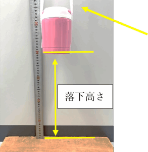 まほうびんに規定の水位位置まで常温水(20℃士15℃)を入れた後に栓又は蓋を締め、40㎝の高さから厚さ3cm以上の硬質の木板上に垂直に落下させる試験です。落下させた製品の水の漏れ及び外観変化を調べ、保温・保冷効力の試験を行ない保温・保冷効力に異常がないことを確認します。