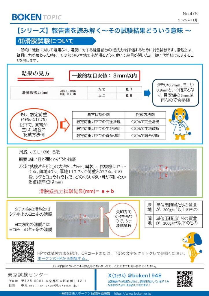 トピック No476_【滑脱試験】報告書を読み解く~その試験結果どういう意味~ 2025/11/10 滑脱試験について 一般的に織物に対して適用され、滑脱に対する縫目部分の抵抗力を評価するために行う試験です。滑脱とは、縫目に力が加わった時に、その部分の生地の糸が滑るように動いて縫目が開いたり、縫い代が抜けたりすることを指します。 試験方法 「JIS L 1096織物及び編物の生地試験方法」に基づいて試験を実施します。一般的にB法がよく用いられます。 1.試験片を所定の大きさにカット、縫製し、 試験機にセットする2.薄地49N、厚地117.7Nで荷重をかける3.タテとヨコそれぞれで、どのくらい縫い目が 開いたかを確認(単位はmm)滑脱抵抗力試験結果(mm)= a + b一般的な目安値:3mm以内 ※異常が生じた場合の記載方法例 異常状態の例記載方法例設定荷重以下での完全滑脱○○Nで完全滑脱設定荷重以下での生地破断○○Nで生地破断設定荷重以下での縫糸切断○○Nで縫糸切断 <薄地と厚地の目安>・薄地 … 単位面積当たりの質量が、200g/㎡以下のもの・厚地 … 単位面積当たりの質量が、200g/㎡以上のもの報告書の内容に関する疑問があれば、お気軽にご相談ください。 PDF記事 PDF記事はこちら 関連記事 過去の記事【①染色堅牢度試験の判定について】はこちら【②耐光試験の判定】はこちら【③洗濯堅ろう度試験の判定】はこちら【④汗試験・水試験の判定】はこちら【⑤摩擦試験の判定】はこちら【⑥異色濃淡の考え方】はこちら【⑦色泣き(ブリード)試験の判定】はこちら【⑧混用率試験について】はこちら【⑨引張強さについて】はこちら【⑩引裂試験について】はこちら【⑪破裂試験について】はこちら お問い合わせ 東京試験センターTEL:03-5669-1380(担当:桑久保、小林、中尾、中井)こちらのお問合せフォームよりご連絡ください。