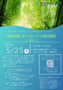 業務案内 「繊維産業におけるLCA人材育成共同講座(2026年度 第1回)」無料公開講座のご案内 2026/4/16 信州大学繊維学部と、当機構を含む繊維系検査機関6社で構成する「繊維産業におけるLCA人材育成コンソーシアム」は、講演会を開催する運びとなりました。2026年度 第1回開催では、5月に公開予定の「アパレル製品の環境影響評価~カーボンフットプリント算定手順書~ Ver.3」について、改正のポイントをご紹介するとともに、LCA算定における実測データの重要性について、本コンソーシアムの取組みを通じて得られた知見や気づきを皆様に共有いたします。皆様のご参加をお待ちしております。 日時:2026年5月25日(月)13:00~15:00会場:信州大学繊維学部Fii(長野県上田市常田3-15-1) Zoom(オンライン併催)受講料:無料 お申し込みはこちら(5月20日 締切)※外部サイトへ移動します。 パンフレットはこちら 関連記事 ・繊維産業におけるLCA人材育成コンソーシアムより、「アパレル製品の環境負荷~カーボンフットプリント算定の手順書Ver.2~」が公開されました。 ・信州大学繊維学部HP(繊維産業におけるLCA人材育成) お問い合わせ 東京試験センター 品質支援課(担当:祖父江)TEL:03-5669-1380こちらのお問合せフォームよりご連絡ください。