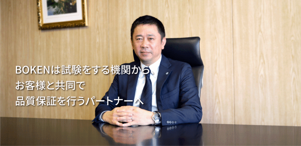 グローバル化に伴う各国法規制への対応、環境問題をはじめとする持続可能な社会への取り組みなど、サプライチェーンにおける製造者・販売者の責任範囲が拡大する中で、試験機関に期待される役割も大きく変化してきています。 そのような状況を背景に、BOKENはこれまで長年、品質評価業務で培ってきた技術、知識をベースに1つ1つの事業分野において、技術力・情報力・対応力を一層高め、お客様との取り組みを通してサービスを積み上げていくことで、これまでの「試験をする機関」から「お客様と共同で品質保証を行うパートナー」への変革を進めて参ります。