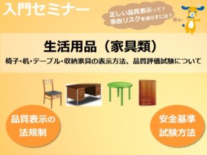 受付中 オンデマンド 入門 日用雑貨景品表示法家具基礎知識ものづくり品質表示事故事例 生活用品入門セミナー(家具類)~椅子・机及びテーブル・収納家具の表示方法、品質評価試験について~ 2025/11/4 家具類(椅子・机及びテーブル・収納家具)について、販売時に関連する家庭用品品質表示法など法律や、重大事故を避ける為に行っておくべき品質評価試験について基礎知識を初心者向けに解説致します。※ベッド類、スプリングマットレス、ウレタンフォームマットレスは含みません。 オンデマンドセミナーのご購入はこちら 配信期間2025年11月4日~配信中開催場所オンデマンドセミナーですレベル入門編料金6,600円(税込)クレジットカード決済または銀行振込でご購入いただけます。クレジットカードの場合は購入後すぐに視聴可能です。銀行振込の場合は弊機構での入金確認後視聴可能となります。※入金確認は翌営業日の午前中、または翌々営業日の午前中となります。入金確認次第メールでご連絡いたします。配信期間内にお早めのお振込みをお願いいたします。視聴期間購入後7日間です。視聴開始となった日が1日目になります。クレジットカード決済の場合:購入日が視聴開始1日目となります。銀行振込の場合:入金確認メールが届いた日が1日目となります。※配信期間終了後は視聴期間内であっても視聴ができなくなります。 動画の視聴方法