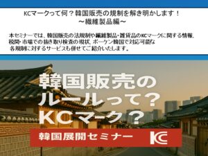 受付中 オンデマンド 初級 日用雑貨アパレル服飾雑貨基礎知識ものづくり品質表示 KCマークって何?韓国販売の規制を解き明かします! ~繊維製品編~ 2026/1/5 近年、若者を中心に日韓の文化交流が活発になり、韓国展開をお考えの企業様が増えています。「韓国販売のルールってどんなものがあるの?KCマークって何のこと?」そんな疑問をお持ちの方へ、本セミナーでは、韓国販売の法規制や繊維製品・雑貨品のKCマークに関する情報、税関・市場での抜き取り検査情報そしてボーケン韓国で対応可能な各規制に対するサービスも併せてご紹介しております。韓国ビジネスの成功に向けた第一歩として、ご興味のある方は是非ともご視聴ください。<このような方にオススメ>韓国での販売をお考えのアパレルや雑貨メーカー、商社などのご担当者様 オンデマンドセミナーのご購入はこちら 配信期間2026年1月5日~2026年6月30日まで※配信期間終了後(6月30日23時59分)を過ぎると視聴できません開催場所オンデマンドセミナーですレベル初級編料金6,600円(税込)クレジットカード決済または銀行振込でご購入いただけます。クレジットカードの場合は購入後すぐに視聴可能です。銀行振込の場合は弊機構での入金確認後視聴可能となります。※入金確認は翌営業日の午前中、または翌々営業日の午前中となります。入金確認次第メールでご連絡いたします。配信期間内にお早めのお振込みをお願いいたします。視聴期間購入後7日間です。視聴開始となった日が1日目になります。クレジットカード決済の場合:購入日が視聴開始1日目となります。銀行振込の場合:入金確認メールが届いた日が1日目となります。※配信期間終了後は視聴期間内であっても視聴ができなくなります。 動画の視聴方法