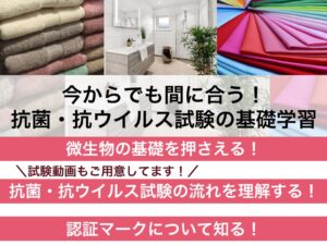 受付中 オンデマンド 初級 日用雑貨繊維品基礎知識ものづくり抗菌・抗ウイルス機能性加工 今からでも間に合う!抗菌・抗ウイルス試験の基礎学習 2026/4/1 近年の衛生志向は高く、抗菌・抗ウイルス加工製品の需要も高いです。本セミナーでは繊維製品と、日用品等の抗菌・抗ウイルス試験について、微生物の基礎知識、試験の概要、SEKやSIAAマークの紹介を中心に解説します。試験のことを知りたい方、基本を学びなおしたい方、新入職員の方におすすめです。※本セミナーは2022年3月~2022年11月まで開催していたセミナーと同内容になります。 オンデマンドセミナーのご購入はこちら 配信期間2026年4月1日~2026年6月30日開催場所オンデマンドセミナーですレベル初級編料金6,600円(税込)クレジットカード決済または銀行振込でご購入いただけます。クレジットカードの場合は購入後すぐに視聴可能です。銀行振込の場合は弊機構での入金確認後視聴可能となります。※入金確認は翌営業日の午前中、または翌々営業日の午前中となります。入金確認次第メールでご連絡いたします。配信期間内にお早めのお振込みをお願いいたします。視聴期間購入後7日間です。視聴開始となった日が1日目になります。クレジットカード決済の場合:購入日が視聴開始1日目となります。銀行振込の場合:入金確認メールが届いた日が1日目となります。※配信期間終了後は視聴期間内であっても視聴ができなくなります。 動画の視聴方法